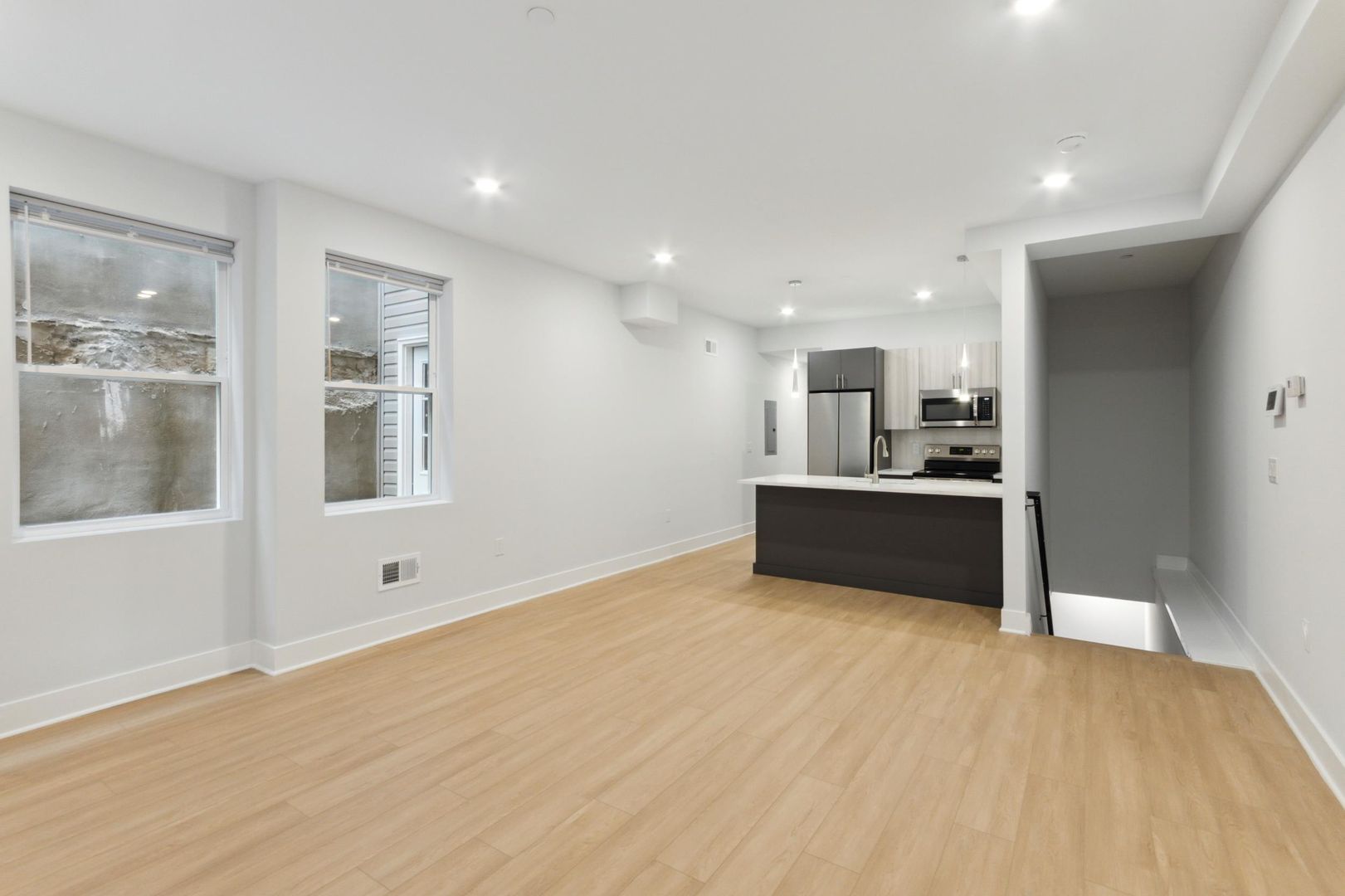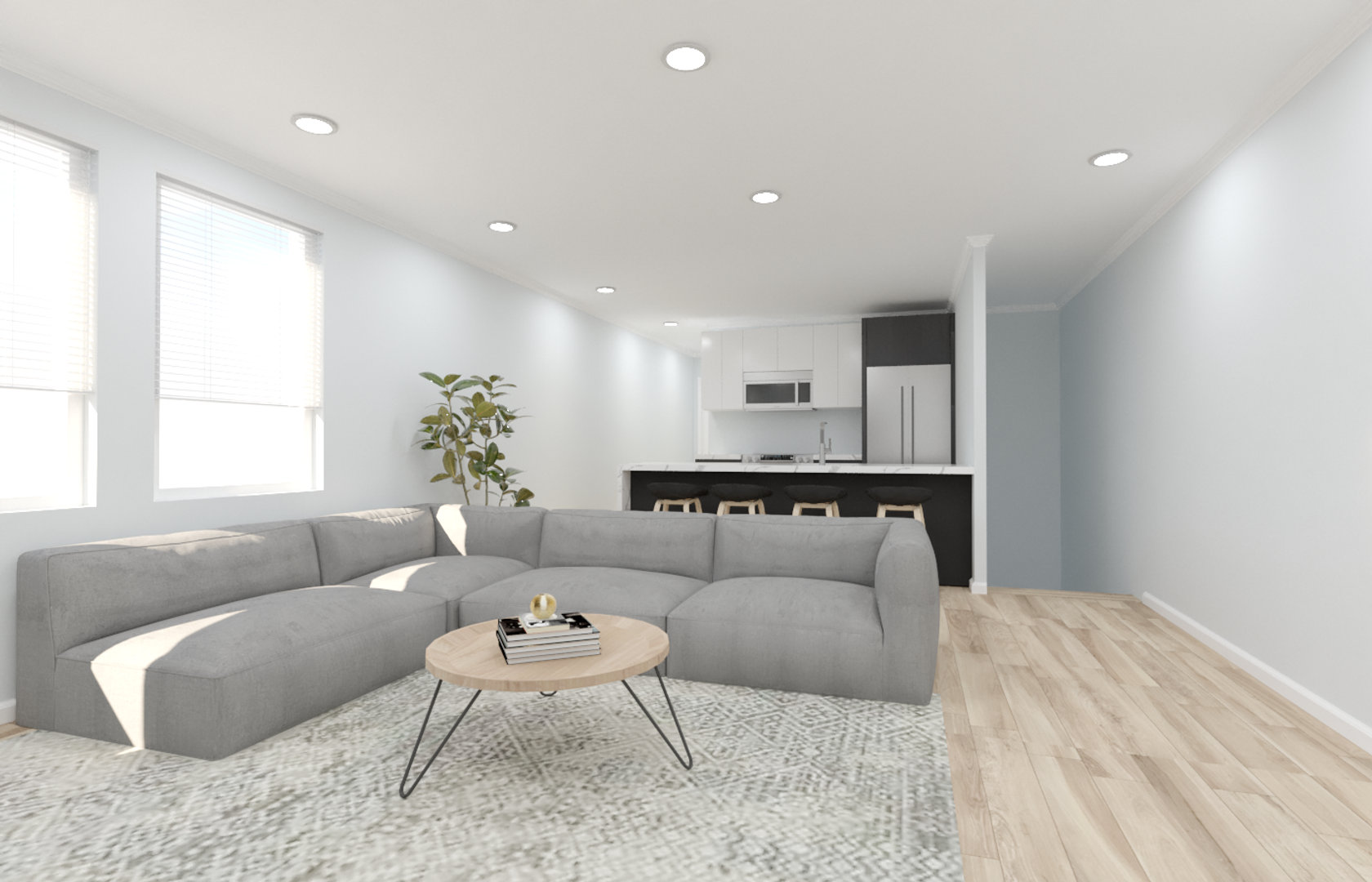 -Modern design, Bright living room, High-end kitchen with large countertop, Open concept kitchen with plenty of cabinets (soft close).