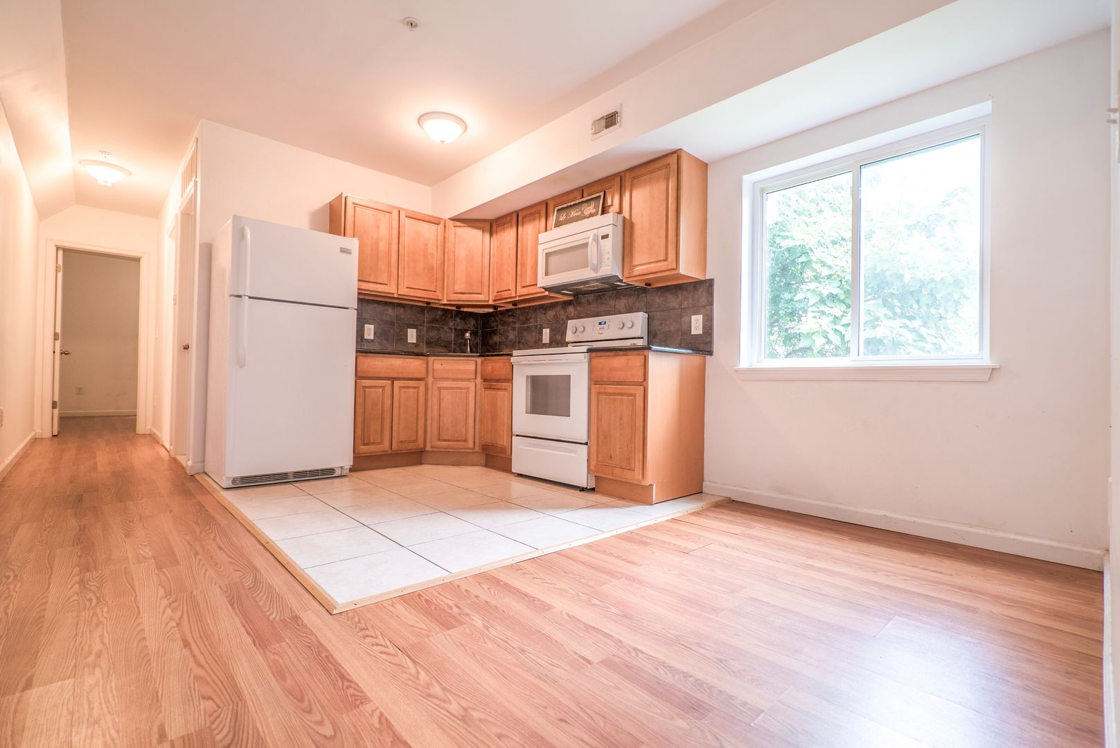 -Electric stove, microwave, refrigerator, garbage disposal, plenty of cabinets in kitchen.